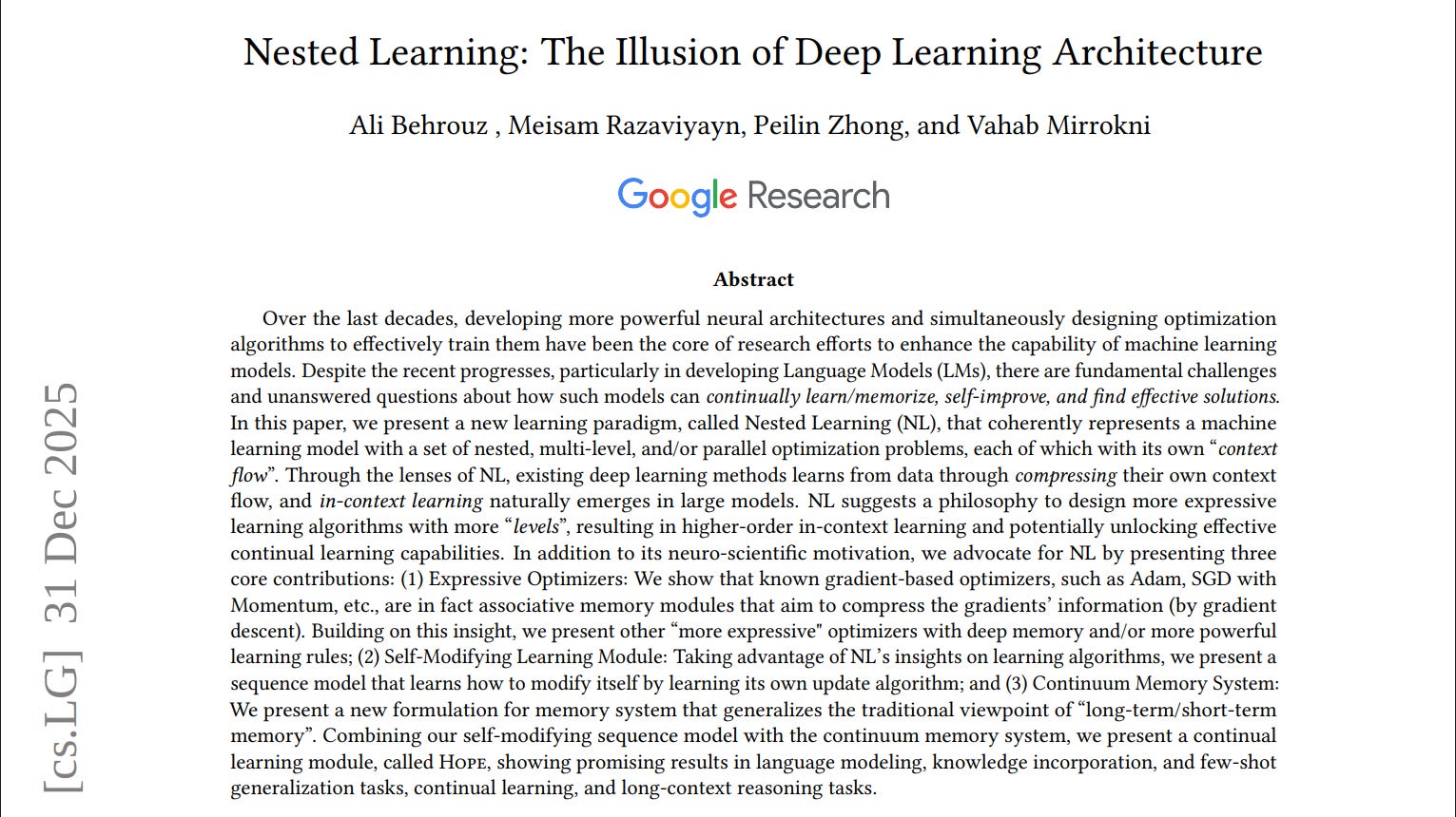 In Dec 2025 ,Google released a paper called Nested Learning: The Illusion of Deep Learning Architecture which attempts to solve the problem by taking inspiration of how memory is developed in human brain over time i.e the idea of short term and long term memory.
